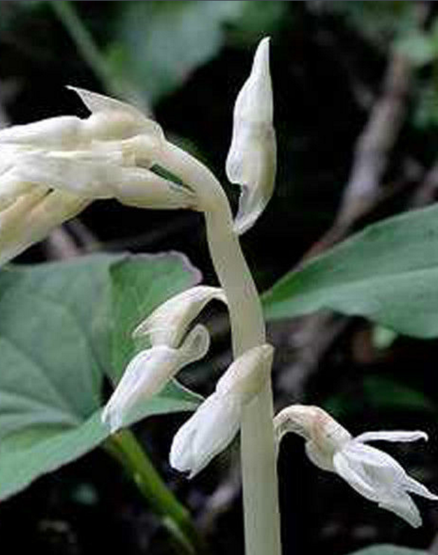 虎舌兰(学名:Epipogium roseum (D. Don) Lindl.):植株高20-45厘米,地下具块茎;块茎狭椭圆形或近椭圆形,肉质,横卧。茎直立,白色,肉质,无绿叶,具4-8枚鞘。总状花序顶生,具6-16朵花;花白色,不甚张开,下垂;萼片线状披针形或宽披针形,花瓣与萼片相似,常略短而宽于萼片;唇瓣凹陷,不裂,卵状椭圆形。蒴果宽椭圆形,长5-7毫米,宽约5毫米。花果期4-6月。