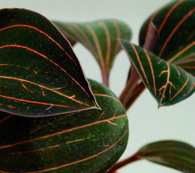血叶兰(学名:Ludisia discolor (Ker-Gawl.) A. Rich.):植株高10-25厘米。根状茎伸长,匍匐,具节。茎直立,在近基部具3-4枚叶。叶片卵形或卵状长圆形,上面黑绿色,具5条金红色有光泽的脉,背面淡红色;叶之上的茎上具2-3枚淡红色的鞘状苞片。总状花序顶生,具几朵至10余朵花;花白色或带淡红色,直径约7毫米;花瓣近半卵形,长8-9毫米,宽2-2.2毫米,先端钝。花期2-4月。