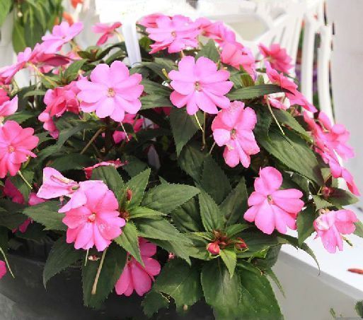 新几内亚凤仙(学名:Impatiens hawkeri W. Bull)多年生常绿草本。茎肉质,分枝多。叶互生,有时上部轮生状,叶片卵状披针形,叶脉红色。花单生或数朵成伞房花序,花柄长,花瓣桃红色、粉红色、橙红色、紫红白色等。花期6--8月。