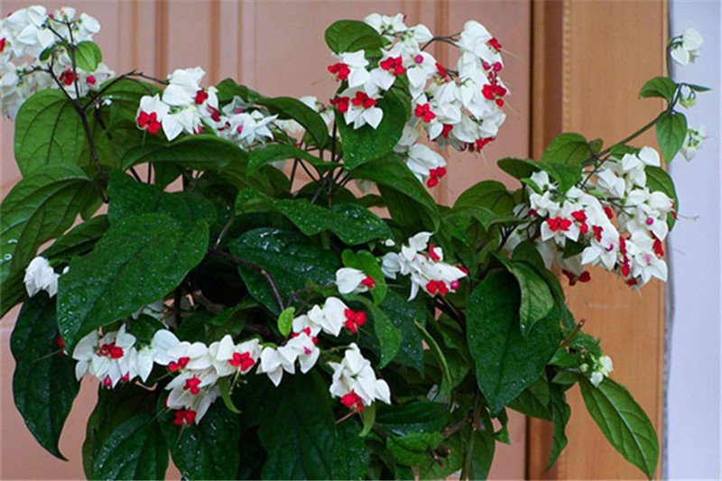 龙吐珠(学名:Clerodendrum thomsonae Balf.):马鞭草科灌木,幼枝四棱形,被黄褐色短绒毛,老时无毛。叶片纸质,狭卵形或卵状长圆形,顶端渐尖,基部近圆形,全缘;聚伞花序腋生或假顶生,二歧分枝;苞片狭披针形;花萼白色,基部合生,中部膨大,裂片三角状卵形,顶端渐尖;花冠深红色,外被细腺毛,裂片椭圆形;雄蕊4,与花柱同伸出花冠外;柱头2浅裂。核果近球形,外果皮光亮,棕黑色;宿存萼不增大,红紫色。花期3-5月。