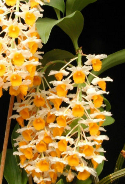 密花石斛(学名:Dendrobium densiflorum Lindl.):茎粗壮,通常棒状或纺锤形,下部常收狭为细圆柱形,不分枝,具数个节和4个纵棱;叶常3-4枚,近顶生,革质,长圆状披针形。总状花序从去年或2年生具叶的茎上端发出,下垂,密生许多花,花开展,萼片和花瓣淡黄色;花瓣近圆形,长1.5-2厘米,宽1.1-1.5厘米,基部收狭为短爪,中部以上边缘具啮齿,具3条主脉和许多支脉;唇瓣金黄色,圆状菱形。花期4-5月。