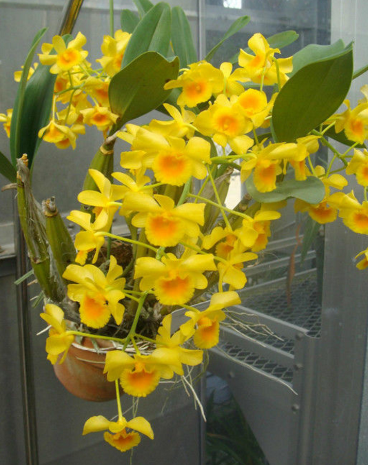 鼓槌石斛(学名:Dendrobium chrysotoxum Lindl.):茎直立,肉质,纺锤形,具2-5节间,具多数圆钝的条棱,近顶端具2-5枚叶。叶革质,长圆形。总状花序近茎顶端发出,斜出或稍下垂,长达20厘米;花质地厚,金黄色,稍带香气;花瓣倒卵形,等长于中萼片,宽约为萼片的2倍,先端近圆形,具约10条脉;唇瓣的颜色比萼片和花瓣深,近肾状圆形。花期3-5月。