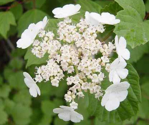 鸡树条(学名:Viburnum opulus Linn. var.calvescens (Rehd.) Hara f. calvescens)是忍冬科,荚蒾属欧洲荚蒾的原变型,落叶灌木植物。高可达4米;冬芽卵圆形,有柄,无毛,叶片轮廓圆卵形至广卵形或倒卵形,通常3裂,掌状,无毛,裂片顶端渐尖,边缘具不整齐粗牙齿,椭圆形至矩圆状披针形而不分裂,边缘疏生波状牙齿,叶柄粗壮,无毛,复伞形式聚伞花序,周围有大型的不孕花,总花梗粗壮,无毛,花生于第二至第三级辐射枝上,花梗极短;萼齿三角形,均无毛;花冠白色,辐状,花药黄白色,不孕花白色,果实红色,近圆形,5-6月开花,果熟期9-10月。