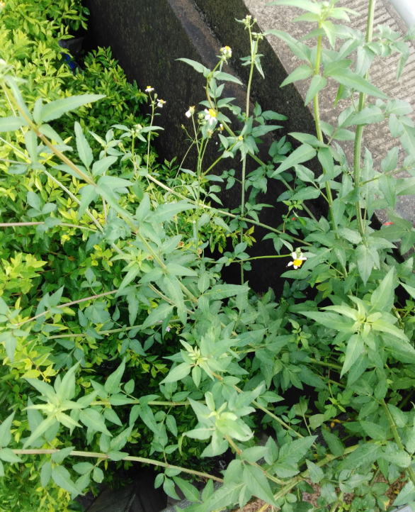 鬼针草(学名:Bidens pilosa L.),一年生草本,茎直立,钝四棱形。茎下部叶较小,很少为具小叶的羽状复叶,两侧小叶椭圆形或卵状椭圆形。头状花序直径8-9毫米。总苞基部被短柔毛,条状匙形,上部稍宽。无舌状花,盘花筒状,冠檐5齿裂。瘦果黑色,条形,略扁,具棱,上部具稀疏瘤状突起及刚毛,顶端芒刺3-4枚,具倒刺毛。