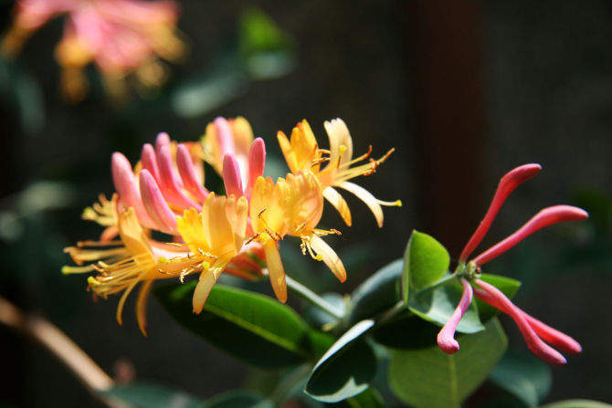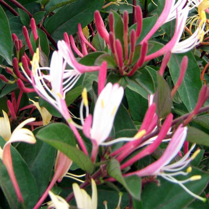 红金银花花蕾、叶、茎均为紫红色,集药用、观赏、绿化于一体。比普通金银花早5-10天,花期长,一般从5月中旬至10月中旬,约150天左右。一年可开4次花。