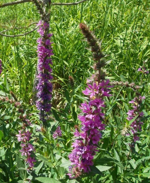 千屈菜,(拉丁学名:Lythrum salicaria L.)千屈菜科、千屈菜属多年生草本,根茎横卧于地下,粗壮;茎直立,多分枝,全株青绿色,略被粗毛或密被绒毛,枝通常具4棱。叶对生或三叶轮生,披针形或阔披针形,顶端钝形或短尖,基部圆形或心形,有时略抱茎,全缘,无柄。花组成小聚伞花序,簇生,因花梗及总梗极短,因此花枝全形似一大型穗状花序;苞片阔披针形至三角状卵形,三角形;附属体针状,直立,红紫色或淡紫色,倒披针状长椭圆形,基部楔形,着生于萼筒上部,有短爪,稍皱缩;伸出萼筒之外;子房2室,花柱长短不一。蒴果扁圆形。