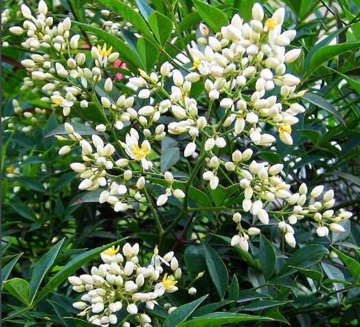 南天竹(学名:Nandina domestica)别名:南天竺,红杷子,天烛子,红枸子,钻石黄,天竹,兰竹;拉丁文名:Nandina domestica.属毛茛目、小檗科下植物,是我国南方常见的木本花卉种类。由于其植株优美,果实鲜艳,对环境的适应性强,常常出现在园林应用中。常见栽培变种有:玉果南天竹,浆果成熟时为白色;绵丝南天竹,叶色细如丝;紫果南天竹,果实成熟时呈淡紫色;圆叶南天竹,叶圆形,且有光泽。因其形态优越清雅,也常被用以制作盆景或盆栽来装饰窗台、门厅、会场等。