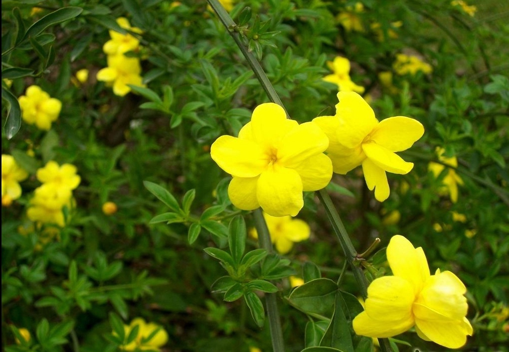 云南黄馨,别名:野迎春、梅氏茉莉、云南迎春、云南黄素馨、金腰带、南迎春,金铃花,拉丁文名:Jasminum mesnyi Hance 属木犀科、素馨属常绿直立亚灌木,高0.5-5米,枝条下垂。小枝四棱形,具沟,光滑无毛。适合花架绿篱或坡地高地悬垂栽培。主要产在我国云南省,生长于海拔500米至2600米的地区,一般生于峡谷或丛林中。