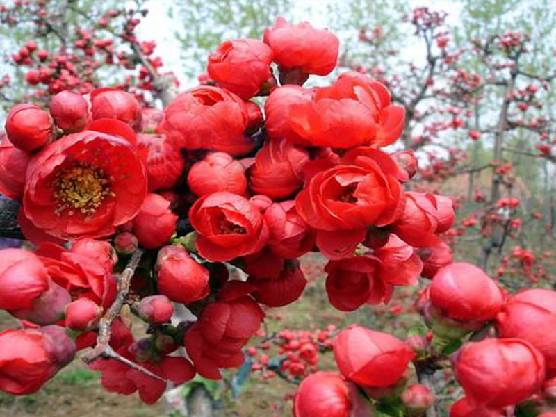 红宝石海棠(学名:Malus micromalus cv. “Ruby”):从美国引种,是集叶、花、果、枝、树形同观共赏的绿化、彩化树种。该树种以其优美的树形、丰富多彩的观赏效果成为中国珍贵的城市绿化彩色树种。具有“叶红、花红、果红、枝亦红”的特点,花、果、枝干、叶在生长期中均表现出红宝石颜色。春季红色的枝条发芽后,其嫩芽嫩叶血红,红宝石海棠整个生长季节叶片呈紫红色,整株色感极好,蜡质光亮。开出花朵粉红色,花期4-5月。坐果后鲜红的果实挂满全树,果为红色梨果,接近于球形,果实成熟期为8-9月份。秋天满树红叶,满枝红果,满树紫枝,果实累累。冬季,鲜红的枝条。