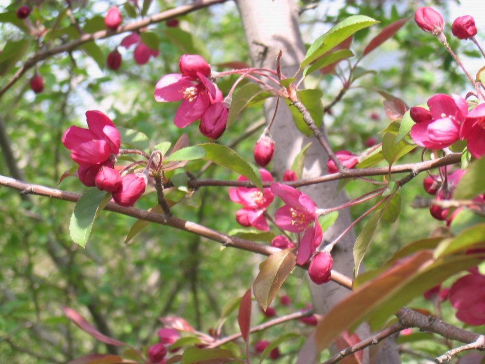 乔木,直立性强,高10m。小枝粗壮,幼时密被绒毛。叶卵状椭圆形,新叶紫红色,边缘具圆钝锯齿,幼时背面有毛。花红色或紫红色,花期5月。果为球形,径1.3cm以上。红色,果期7~10月。春季红花满树,夏秋季红果累累,经久不凋,甚为美观。耐寒性强,为优良的观花观果树种。适合在我国北方地区种植观赏。