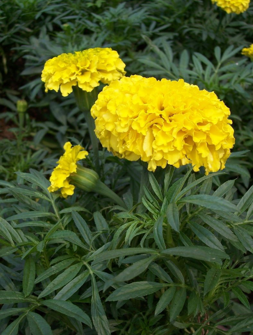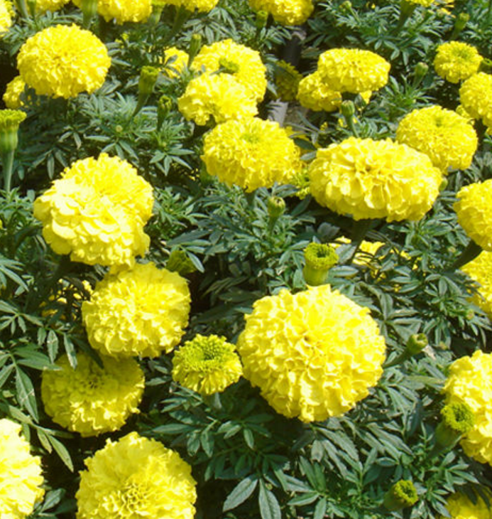 万寿菊(Tagetes erecta L)为菊科万寿菊属一年生草本植物,茎直立,粗壮,具纵细条棱,分枝向上平展。叶羽状分裂;沿叶缘有少数腺体。头状花序单生;总苞杯状,顶端具齿尖;舌状花黄色或暗橙色;管状花花冠黄色。瘦果线形,基部缩小,黑色或褐色,被短微毛;冠毛有1-2个长芒和2-3个短而钝的鳞片。花期7-9月。