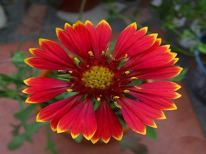 天人菊(学名:Gaillardia pulchella Foug)菊科一年生草本,高20-60厘米。茎中部以上多分枝,分枝斜升,被短柔毛或锈色毛。下部叶匙形或倒披针形,边缘波状钝齿、浅裂至琴状分裂,先端急尖,近无柄,上部叶长椭圆形,倒披针形或匙形,叶两面被伏毛。头状花序径5厘米。总苞片披针形,边缘有长缘毛,背面有腺点。舌状花黄色,基部带紫色,舌片宽楔形,顶端2-3裂;管状花裂片三角形,被节毛。瘦果长2毫米,基部被长柔毛。冠毛长5毫米。花果期6-8月。