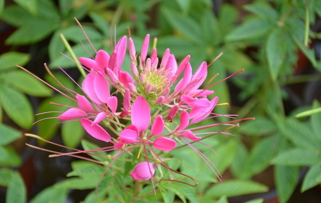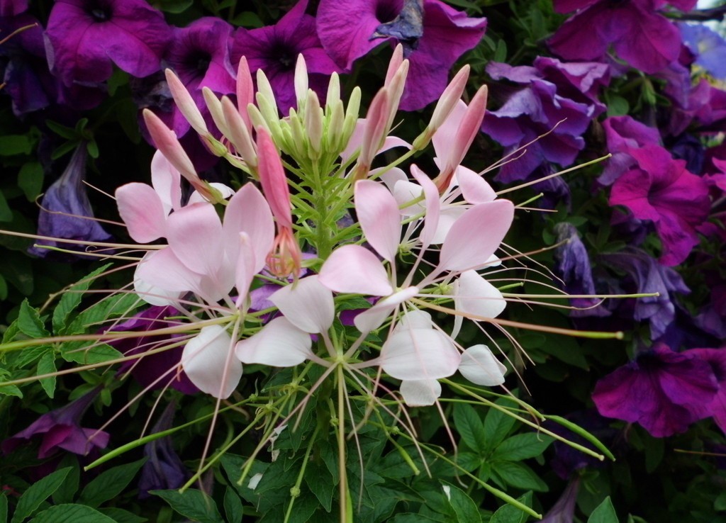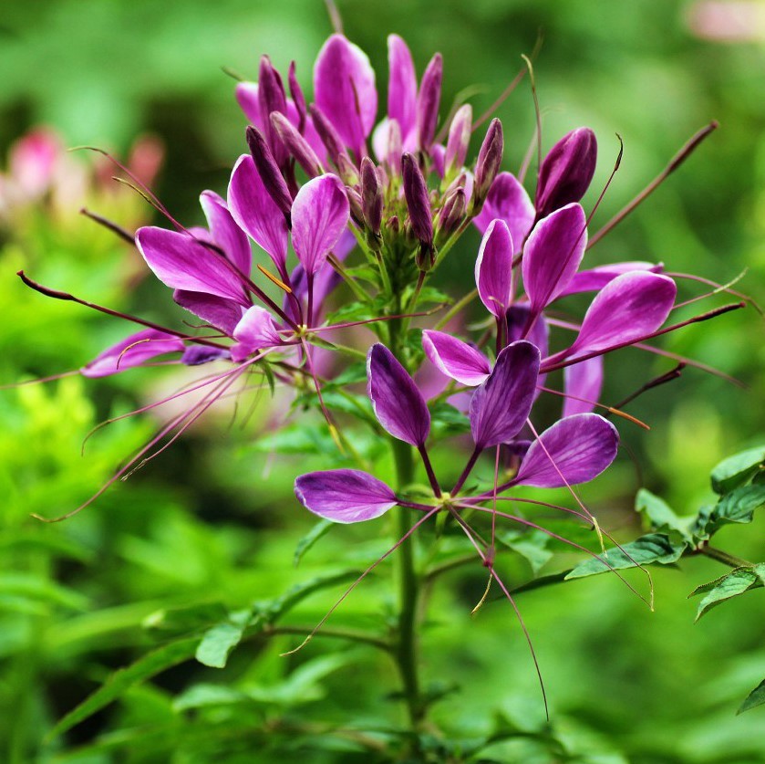 醉蝶花(学名:Cleome spinosa Jacq.):一年生草本植物。花茎直立,株高40厘米-60厘米,有的品种可达1米, 其茎上长有粘汁细毛,会散发一股强烈的特殊气味;叶片为掌状复叶,小叶5枚-7枚,为矩圆状披针形;总状花序顶生,花由底部向上次第开放,花瓣披针形向外反卷,花苞红色,花瓣呈玫瑰红色或白色,雄蕊特长;蒴果圆柱形,种子浅褐色。花期在6月-9月,其花茎长而壮实,花朵盛开时,总状花序形成一个丰满的花球,朵朵小花犹如翩翩起舞的蝴蝶,非常美观。 中国无野生,各大城市常见栽培。原产热带美洲,全球热带至温带栽培以供观赏,也是一种优良的蜜源植物。