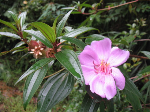 多花野牡丹(学名:Melastoma affine D. Don),别名酒瓶果、催生药、野广石榴、乌提子、瓮登木、山甜娘、老鼠丁根、基尖叶野牡丹,野牡丹科、酸脚杆属灌木,高约1米;茎钝四棱形或近圆柱形,分枝多,密被紧贴的鳞片状糙伏毛,毛扁平,边缘流苏状。叶片坚纸质,披针形、卵状披针形或近椭圆形,顶端渐尖,基部圆形或近楔形,全缘,5基出脉,叶面密被糙伏毛,基出脉下凹,背面被糙伏毛及密短柔毛,基出脉隆起,侧脉微隆起,脉上糙伏毛较密;蒴果坛状球形,顶端平截,与宿存萼贴生;宿存萼密被鳞片状糙伏毛;种子镶于肉质胎座内。花期2-5月,果期8-12月,稀1月。