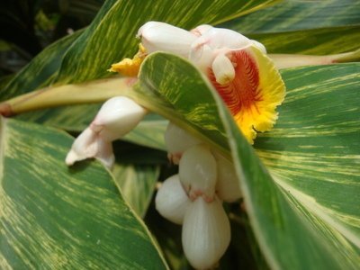 花叶姜:根茎类,观叶植物,多年生常绿草本植物,花苞片白色,边缘黄色,顶端及基部粉红色,花冠白色,花期6-8月,喜高温多湿环境,不耐寒,怕霜雪,喜阳光,又耐半荫。适宜生长于肥沃、疏松而排水良好的沙壤中。生长适温为15-30℃,越冬温度为5℃左右。冬季需温暖避风,喜明亮的光照,但也耐半阴,忌全天强光直射。常用作园林灌木种植,能快速形成良好效果,冬季施工时需做好保温工作。