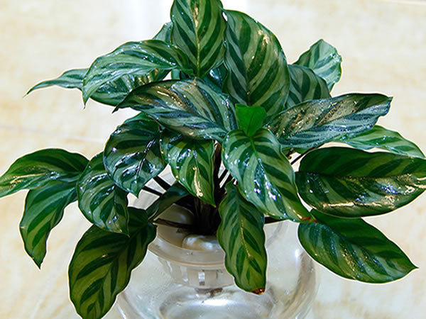 孔雀竹芋(学名:Calathea makoyana E. Morr.):竹芋科,肖竹芋属多年生常绿草本。植株挺拔株高可达60厘米。叶柄紫红色, 叶片薄革质,卵状椭圆形,叶面上有墨绿与白色或淡黄相间的羽状斑纹,就像孔雀尾羽毛上的图案,因而得名。叶片亦有特性:白天舒展,晚间折叠起来。