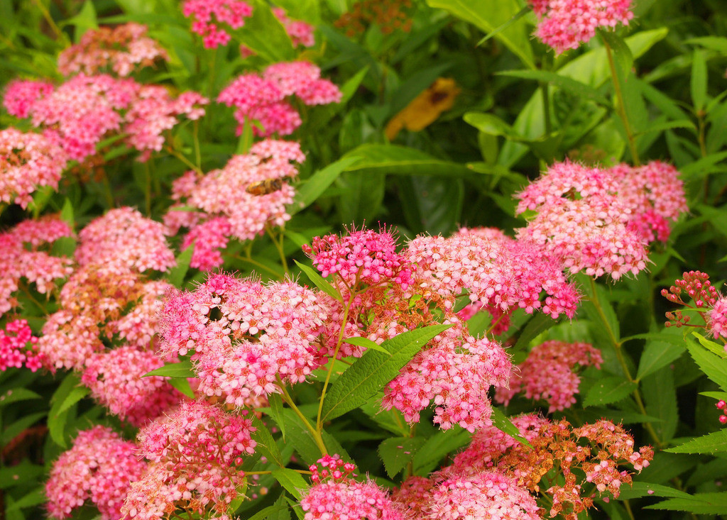 粉花绣线菊(学名:Spiraea japonica L. f.),别名蚂蟥梢、火烧尖、日本绣线菊,蔷薇科、绣线菊属直立灌木,高可达1.5米;枝条开展细长,圆柱形,冬芽卵形,叶片卵形至卵状椭圆形,上面暗绿色,下面色浅或有白霜,通常沿叶脉有短柔毛;复伞房花序,花朵密集,密被短柔毛;苞片披针形至线状披针形,萼筒钟状,萼片三角形,花瓣卵形至圆形,粉红色;花盘圆环形,蓇葖果半开张,花柱顶生,6-7月开花,8-9月结果。有时有2次开花。