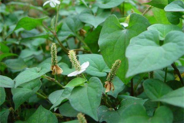 鱼腥草(拉丁学名:Houttuynia cordata Thunb.)是中国药典收录的草药,草药来源为三白草科植物蕺菜的干燥地上部分。夏季茎叶茂盛花穗多时采割,除去杂质,晒干。 草药性状:茎呈扁圆柱形,扭曲,长20~35cm,直径0.2~0.3cm;表面棕黄色,具纵棱数条,节明显,下部节上有残存须根;质脆,易折断。叶互生,叶片卷折皱缩,展平后呈心形,长3~5cm,宽3~4.5cm;先端渐尖,全缘;上表面暗黄绿色至暗棕色,下表面灰绿色或灰棕色;叶柄细长,基部与托叶合生成鞘状。穗状花序顶生,黄棕色。搓碎有鱼腥气味。 鱼腥草味辛,性寒凉,归肺经。能清热解毒、消肿疗疮、利尿除湿、清热止痢、健胃消食,用治实热、热毒、湿邪、疾热为患的肺痈、疮疡肿毒、痔疮便血、脾胃积热等。现代药理实验表明,本品具有抗菌、抗病毒、提高机体免疫力、利尿等作用。