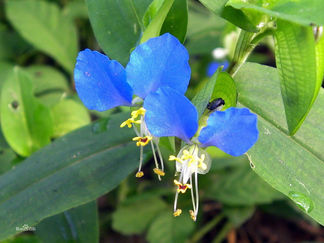 鸭跖草叶形为披针形至卵状披针形,叶序为互生,茎为匍匐茎,花朵为聚花序,顶生或腋生,雌雄同株,花瓣上面两瓣为蓝色,下面一瓣为白色,花苞呈佛焰苞状,绿色,雄蕊有6枚。