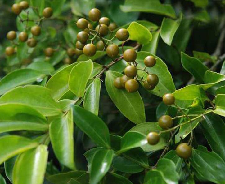 马钱子(学名: Strychnos nux-vomica L.)别名:士的宁树、番木鳖、苦实把豆儿、火失刻把都、苦实、马前、牛眼、大方八、马钱树,马钱科、马钱属乔木。枝条幼时被微毛,老枝被毛脱落。叶片纸质,近圆形、宽椭圆形至卵形,顶端短渐尖或急尖,基部圆形,有时浅心形,上面无毛;具网状横脉;圆锥状聚伞花序腋生,花序梗和花梗被微毛;苞片小,被短柔毛;花萼裂片卵形,外面密被短柔毛;花冠绿白色,后变白色,花冠管比花冠裂片长,外面无毛,内面仅花冠管内壁基部被长柔毛,花冠裂片卵状披针形,长约3毫米;雄蕊着生于花冠管喉部,花药椭圆形,伸出花冠管喉部之外,花丝极短;子房卵形,无毛,花柱圆柱形,柱头头状。浆果圆球状,成熟时桔黄色,种子扁圆盘状,表面灰黄色,密被银色绒毛。花期春夏两季,果期8月至翌年1月。