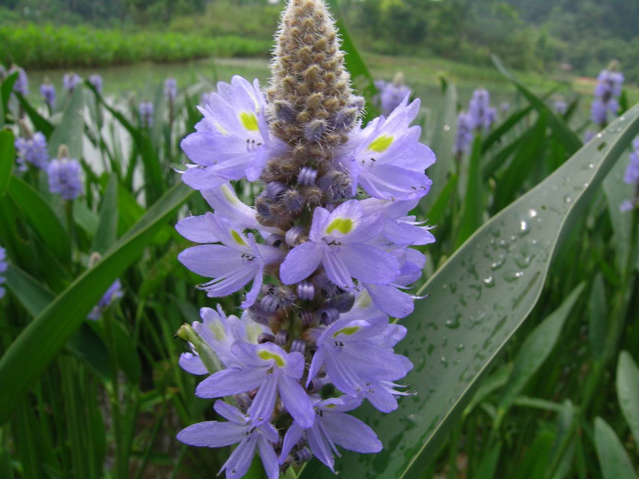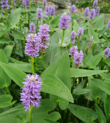 梭鱼草(学名:Pontederia cordata L.)是雨久花科,梭鱼草属多年生挺水或湿生草本植物,株高可达150厘米,地茎叶丛生,圆筒形叶柄呈绿色,叶片较大,深绿色,表面光滑,叶形多变,但多为倒卵状披针形。花葶直立,通常高出叶面,穗状花序顶生,每条穗上密密的簇拥着几十至上百朵蓝紫色圆形小花,上方两花瓣各有两个黄绿色斑点,质地半透明,5-10月开花结果。