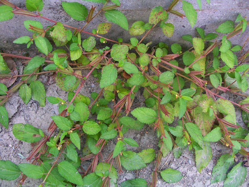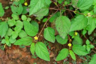 甜麻, 一年生草本,高约1米,茎红褐色,稍被淡黄色柔毛;枝细长,披散。叶卵形或阔卵形,长4.5-6.5厘米,宽3-4厘米,顶端短渐尖或急尖,基部圆形,两面均有稀疏的长粗毛,边缘有锯齿,近基部一对锯齿往往延伸成尾状的小裂片,基出脉5-7条;叶柄长0.9-1.6厘米,被淡黄色的长粗毛。花单独或数朵组成聚伞花序生于叶腋或腋外,花序柄或花柄均极短或近于无;萼片5片,狭窄长圆形,长约5毫米,上部半凹陷如舟状,顶端具角,外面紫红色;花瓣5片,与萼片近等长,倒卵形,黄色;雄蕊多数,长约3毫米,黄色;子房长圆柱形,被柔毛,花柱圆棒状,柱头如喙,5齿裂。蒴果长筒形,长约2.5厘米,直径约5毫米,具6条纵棱,其中3-4棱呈翅状突起,顶端有3-4条向外延伸的角,角二叉,成熟时3-4瓣裂,果瓣有浅横隔;种子多数。花期夏季。