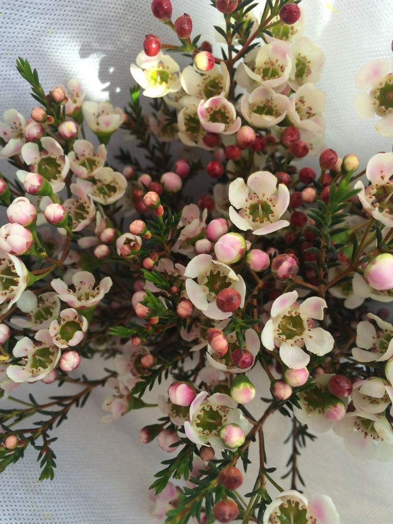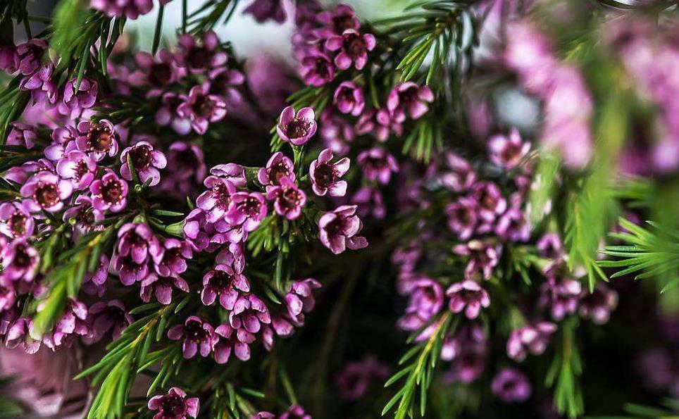 杰拉尔顿腊花(学名:Chamelaucium uncinatum )桃金娘科植物,即淘金彩梅,又名蜡花或风蜡花,花形像梅花。无论是近看和远看,不认识她的人均以为是小松树开了满树漂亮的花,似常年翠绿的松枝上绽放着可爱的梅花。其观赏视觉层次丰富,对照颜色反差大而鲜艳,既可以观叶又可以观花。