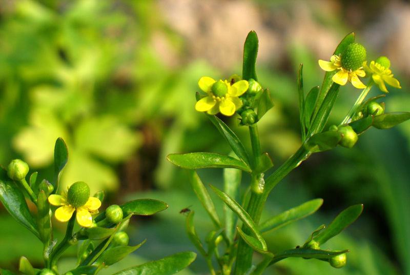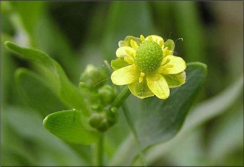 石龙芮(学名:Ranunculus sceleratus L.):毛茛科,石龙芮一年生草本植物。须根簇生。茎直立,高可达50厘米,基生叶多数;叶片肾状圆形,茎生叶多数,聚伞花序有多数花;花小,萼片椭圆形,花瓣倒卵形,花药卵形,聚合果长圆形,瘦果近百枚极多数,5月至8月花果期。
