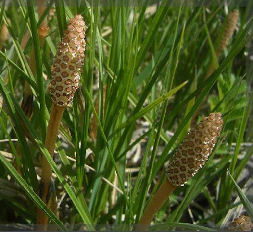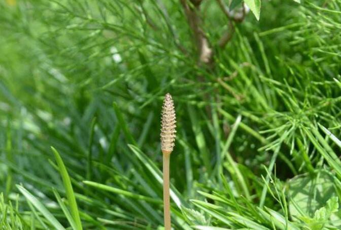 问荆(学名:Equisetum arvense L.)是木贼科,问荆属中小型蕨类植物。根茎黑棕色,地上枝当年枯萎。枝二型。高可达35厘米,黄棕色,鞘筒栗棕色或淡黄色,栗棕色,狭三角形,孢子散后能育枝枯萎。不育枝后萌发,鞘齿三角形,宿存。侧枝柔软纤细,扁平状,孢子囊穗圆柱形,顶端钝,成熟时柄伸长。