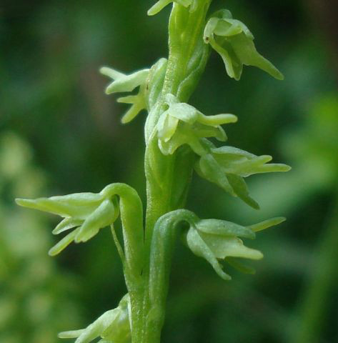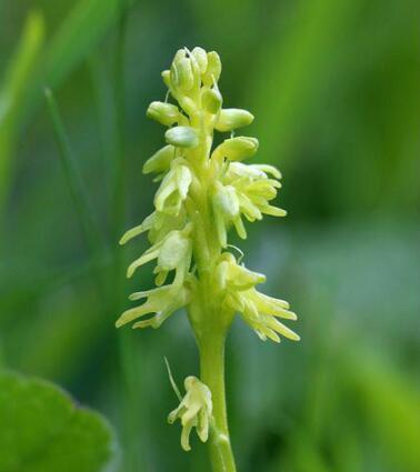 角盘兰(学名:Herminium monorchis (L. ) R. Br.):植株高5.5-35厘米。块茎球形,直径6-10毫米,肉质。茎直立,无毛,基部具2枚筒状鞘,下部具2-3枚叶。叶片狭椭圆状披针形或狭椭圆形,直立伸展。总状花序具多数花,圆柱状,长达15厘米;花小,黄绿色,垂头,萼片近等长,具1脉;花瓣近菱形,上部肉质增厚,较萼片稍长,向先端渐狭,或在中部多少3裂;唇瓣与花瓣等长,肉质增厚,基部凹陷呈浅囊状,近中部3裂。花期6-8月。