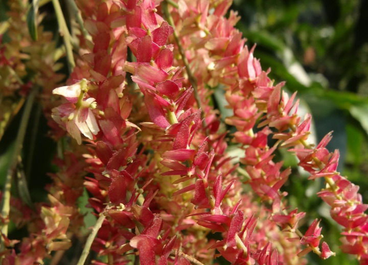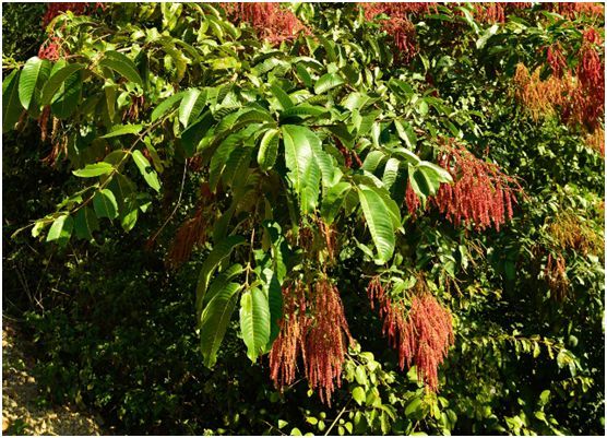 千果榄仁(学名:Terminalia myriocarpa Vaniot Huerck et Muell.-Arg.)使君子科、诃子属常绿乔木,高可达35米,小枝圆柱状,叶对生,厚纸质;叶片长椭圆形,侧脉两面明显,叶柄较粗,大型圆锥花序,顶生或腋生,花极小而数,两性,红色,小苞片三角形,宿存;萼筒杯状,瘦果细小,翅膜质,8-9月开花,10月至翌年1月结果。