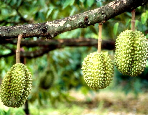 榴莲树,常绿乔木。叶子长椭圆形,表面光滑,背面生鳞片。果实球形,表面有很多硬刺,果肉味美,为热带著名果品之一。原产马来西亚,我国广东﹑海南也有。