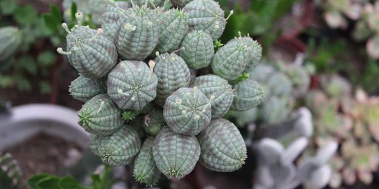 布纹球(学名:Euphorbia obesa) 又名晃玉、奥贝莎,属于大戟科大戟属植物。原产南非开普省。植株小球形,直径8-12厘米。具棱8,整齐。表皮灰绿色中有红褐色纵横交错的条纹,顶部条纹较密。棱缘上有褐色小钝齿。