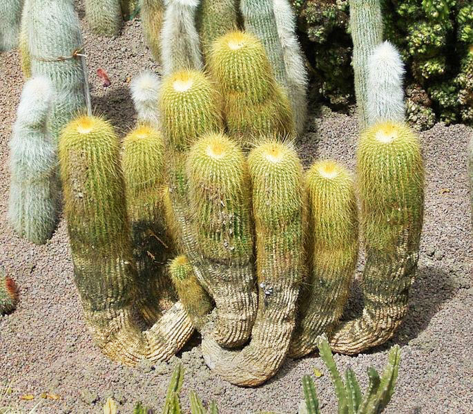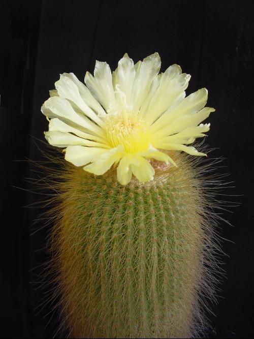 金晃,又名黄翁,是仙人掌科南国玉属,茎圆柱形,高60~70cm,直径10cm.,基部易出分枝。棱30或更多,刺座排列紧密。周刺15,刚毛状,长0.3~0.7cm.,黄白色;中刺3~4,长4cm,黄色,细针状。花着生茎顶端,长4cm,直径5cm j黄色。植株高20cm左右才开花,开花时球端白毛增多。