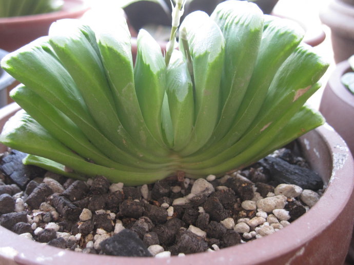 玉扇(学名:Haworthia truncata) 又名截形瓦苇,是阿福花科瓦苇属的多肉植物(。植株无茎,肉质叶排成两列呈扇形,叶片直立,稍向内弯,顶部略凹陷。叶表粗糙,绿色至暗绿褐色,有小疣状突起;新叶的截面部分透明,呈灰白色。习性强健,根系比较粗壮。有些品种叶片截面上还有灰白色透明状花纹。其园艺品种玉扇锦叶子上有黄色或粉红色斑纹,更为美丽。