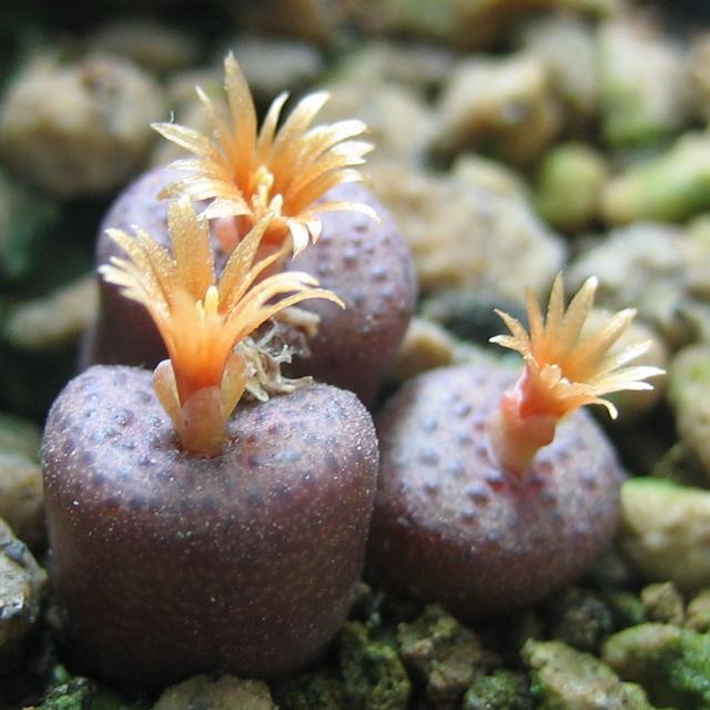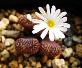 肉锥花(学名:Conophytum spp.),属石竹目番杏科肉锥花属植物的统称,品种繁多,形态各异。肉锥花无茎,根上面直接长有高度肉质化的变态叶作为储水结构,叶形有球形、倒圆锥形,其下部联合,浑然一体,顶部有深浅不一的裂缝,颜色有暗绿、翠绿、黄绿等色,有些品种叶片上还有花纹或斑点。花黄、白或紫色。