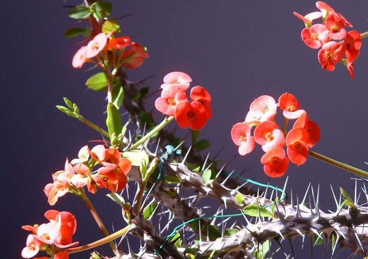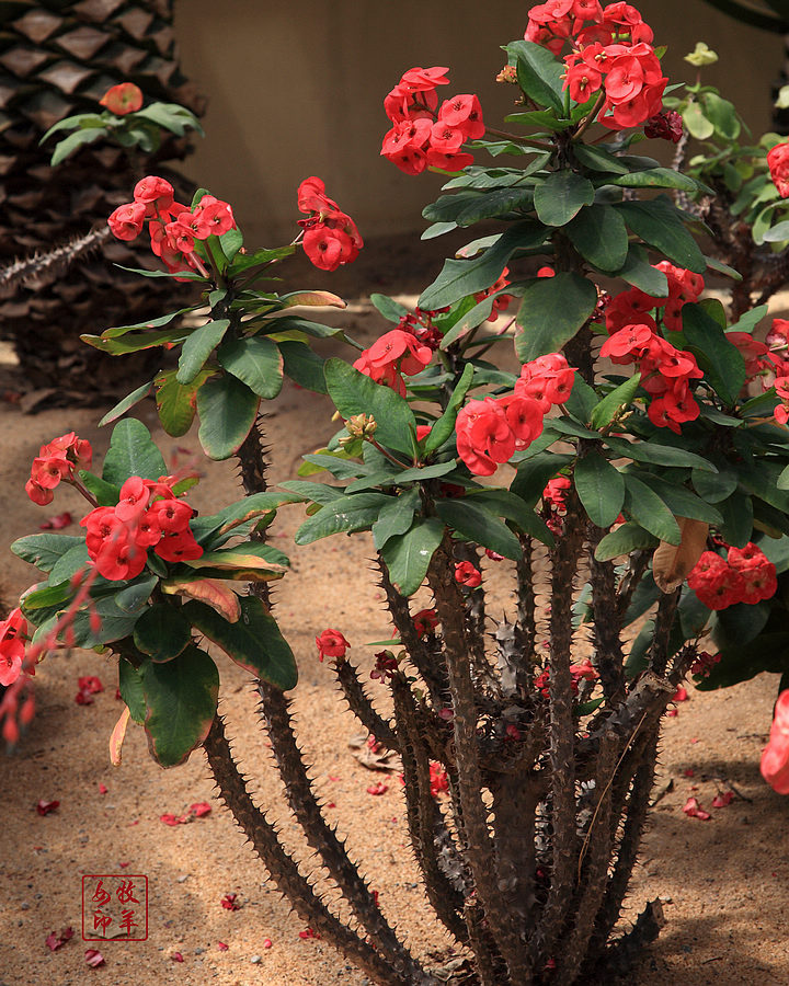 虎刺梅(学名:Euphorbia milii Ch. des Moulins):别称铁海棠,是蔓生灌木植物。茎多分枝,长60-100厘米,直径5-10毫米,具纵棱,密生硬而尖的锥状刺,刺长1-1.5厘米,直径0.5-1.0 毫米,常呈3-5列排列于棱脊上,呈旋转。叶互生,通常集中于嫩枝上,倒卵形或长圆状匙形,全缘。花序2或8个组成二歧状复花序,生于枝上部叶腋;柄基部具1枚膜质苞片,苞叶2枚,肾圆形,总苞钟状,边缘5裂,黄红色。雄花数枚,雌花1枚,常包于总苞内。蒴果三棱状卵形,种子卵柱状,直径约2毫米,灰褐色。花果期全年。