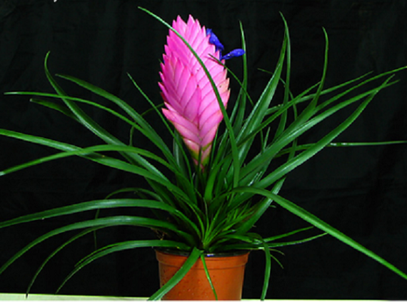紫凤梨(学名:Tillandsia cyanea Linden ex K. Koch)凤梨科铁兰属观赏植物。体型不大,株高不及30厘米。叶窄线形,长20厘米-30厘米,宽1-1.5厘米,簇生,浓绿色,质硬面是凹弧状,中部带有紫褐色斑晕背绿褐色。花序梗自叶丛中抽生,长约20厘米,顶端12-15厘米处扁平,形成穗状花序,宽4-4.5厘米,由粉红色近淡紫色的苞片对生组;青紫色小花由苞片内开出,约20朵之多,花瓣卵形,3片;冠径约3厘米,形似蝴蝶。苞片可观赏达数月之久。