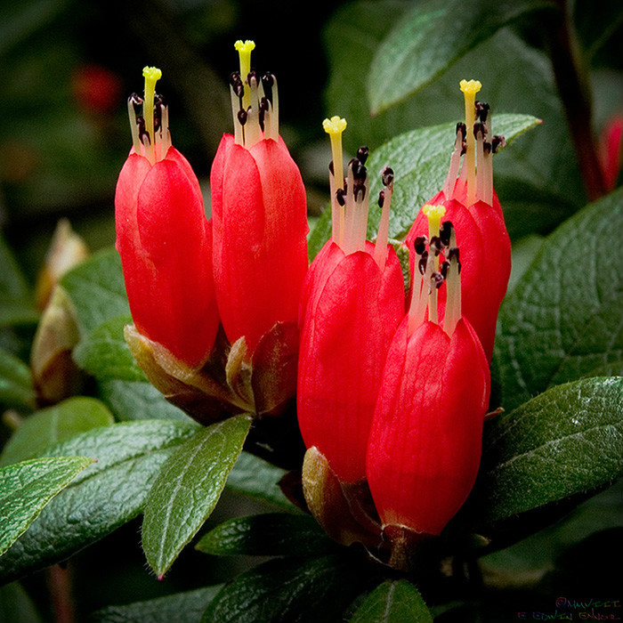 爆杖花(学名:Rhododendron spinuliferum Franch.):灌木,高0.5-3.5米。幼枝被灰色短柔毛,杂生长刚毛,老枝褐红色,近无毛。叶坚纸质,散生,叶片倒卵形、椭圆形、椭圆状披针形或披针形。花序腋生枝顶成假顶生;花冠筒状,两端略狭缩,长1.5-2.5厘米,朱红色、鲜红色或橙红色,上部5裂,裂片卵形,直立。蒴果长圆形,长1-1.4厘米,被疏茸毛并可见鳞片。花期2-6月。