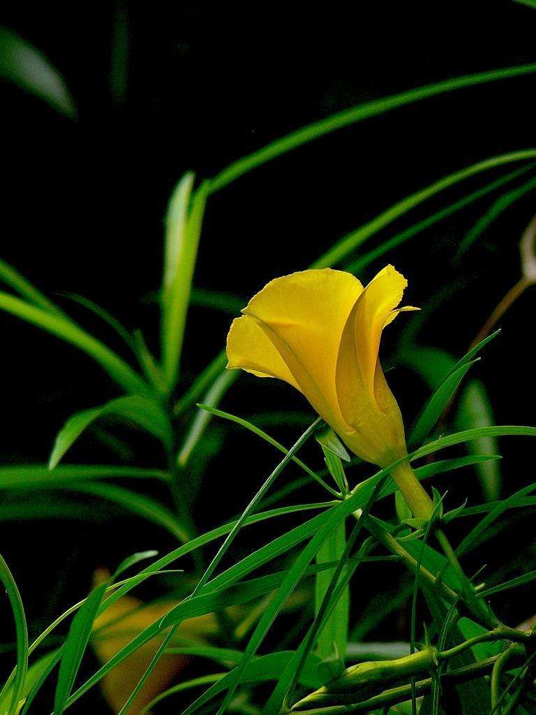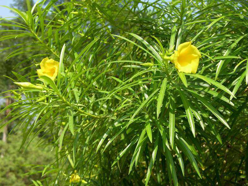 黄花夹竹桃(学名:Thevetia peruviana (Pers.) K. Schum.)夹竹桃科常绿小乔木。又名酒杯花。常绿灌木,高2~5米,直立;全体光滑无毛,有乳液。树皮棕褐色,皮孔明显;小枝下垂,灰绿色。叶互生,无柄,革质,线形,长10~15厘米,宽7~10毫米,鲜绿色,光亮,背面较淡,边稍背卷,中肋明显。聚伞花序顶生,有总柄,通常六花成簇,黄色,芳香;花梗长约2厘米;萼片5,绿色,三角形,长7~9毫米。