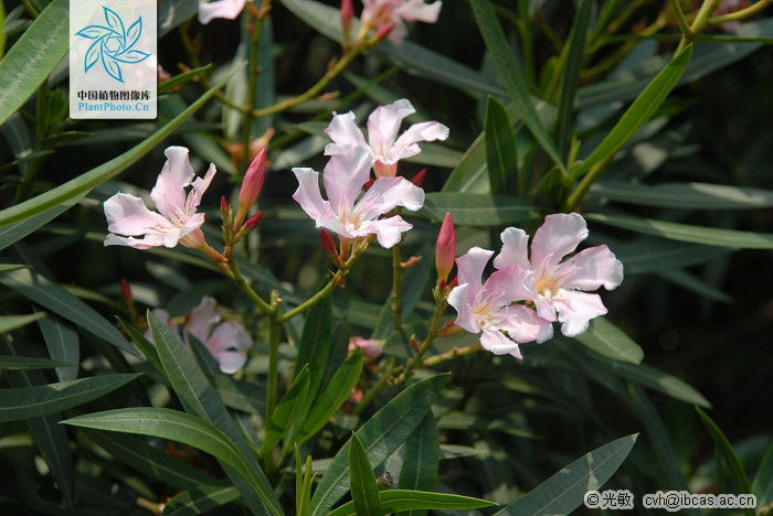 欧洲夹竹桃(Nerium oleander L.)直立灌木,枝条灰绿色,含水液。叶轮生,稀对生,具柄,革质,羽状脉,侧脉密生而平行。伞房状聚伞花序顶生,具总花梗;花萼5裂,裂片披针形,双覆盖瓦状排列,内面基部具腺体;花冠漏斗状,红色、栽培有演变为白色或黄色,花冠筒圆筒形,上部扩大呈钟状,喉部具5枚阔鳞片状副花冠,每片顶端撕裂;花冠裂片5,或更多而呈重瓣,斜倒卵形,花蕾时向右覆盖;雄蕊5,着生在花冠筒中部以上,花丝短,花药箭头状,附着在柱头周围,基部具耳,顶端渐尖,药隔延长成丝状,被长柔毛;无花盘;子房由2枚离生心皮组成,花柱丝状或中部以上加厚,柱头近球状,基部膜质环状,顶端具尖头;每心皮有胚珠多颗。蓇葖2,离生,长圆形;种子长圆形,种皮被短柔毛,顶端具种毛。