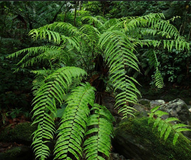 肾蕨(学名:Nephrolepis auriculata (L. )Trimen):附生或土生。根状茎直立,被蓬松的淡棕色长钻形鳞片,下部有粗铁丝状的匍匐茎向四方横展,匍匐茎棕褐色,不分枝,疏被鳞片,有纤细的褐棕色须。叶簇生,暗褐色,略有光泽,叶片线状披针形或狭披针形,一回羽状,羽状多数,互生,常密集而呈覆瓦状排列,披针形,叶缘有疏浅的钝锯齿。叶脉明显,侧脉纤细,自主脉向上斜出,在下部分叉。叶坚草质或草质,干后棕绿色或褐棕色,光滑。孢子囊群成1行位于主脉两侧,肾形,生于每组侧脉的上侧小脉顶端,位于从叶边至主脉的1/3处;囊群盖肾形,褐棕色,边缘色较淡,无毛。