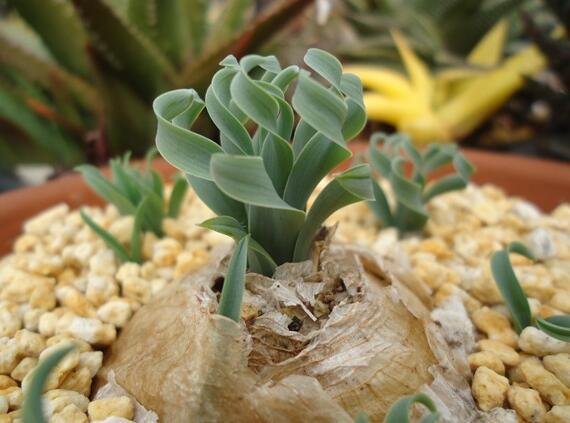 宽叶弹簧草,植株具圆球状鳞茎,其表皮露出土面部分为绿色,为风信子科、虎眼万年青属鳞茎植物。