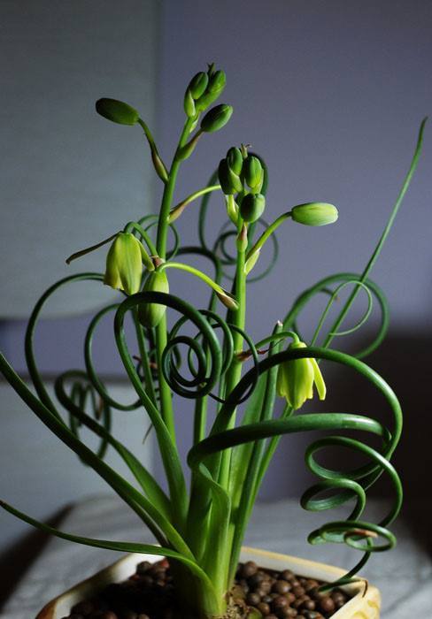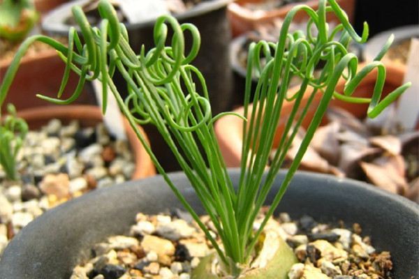 弹簧草(学名:Albuca namaquensis Baker)也称螺旋草,因叶片螺旋生长形似弹簧而得名。是风信子科,哨兵花属多年生鳞茎类多肉植物,植株具圆形或不规则形鳞茎,其鳞茎由一层层肥厚的肉质鳞片组成,地下部分的表皮黄白色,露出土面的部分经日晒后呈绿白色。其线形叶由鳞茎顶部抽出,最初直立生长,以后逐渐扭曲盘旋。花梗由叶丛中抽出,总状花序,小花下垂,花瓣正面淡黄色,背面黄绿色,有些品种具芳香。花朵一般在阳光充足时开放,傍晚闭合,如此昼开夜闭,单朵花可持续开放5 天左右,若遇阴雨天或栽培环境光照不足则难以开花,花期3 - 4 月。